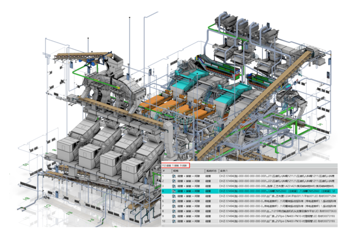 廠房水、暖、電、工藝管路、管線較多,二維圖紙難以發(fā)現(xiàn)隱蔽的碰撞問題。設(shè)計過程中,采用3DE碰撞檢測功能,解決大量設(shè)計錯/漏/碰撞問題,極大縮短校核時間。