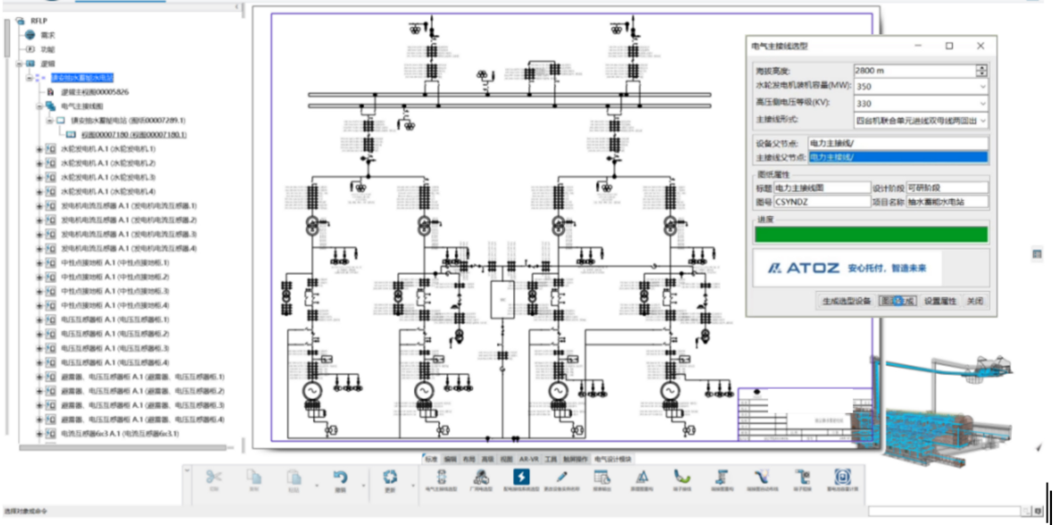 主接線圖設(shè)計(jì)師根據(jù)項(xiàng)目選址選型基本輸入條件,輸入海拔高度、裝機(jī)容量、高壓側(cè)電壓等級(jí)和主接線形式,系統(tǒng)根據(jù)輸入?yún)?shù),調(diào)用選型資源規(guī)格配置數(shù)據(jù)庫(kù),在所選結(jié)構(gòu)樹(shù)上自動(dòng)生成主接線圖選型設(shè)備。根據(jù)主接線形式,將設(shè)備符號(hào)在生成的主接線圖視圖中給出初步圖面布局方案,實(shí)現(xiàn)主接線圖自動(dòng)化設(shè)計(jì)。