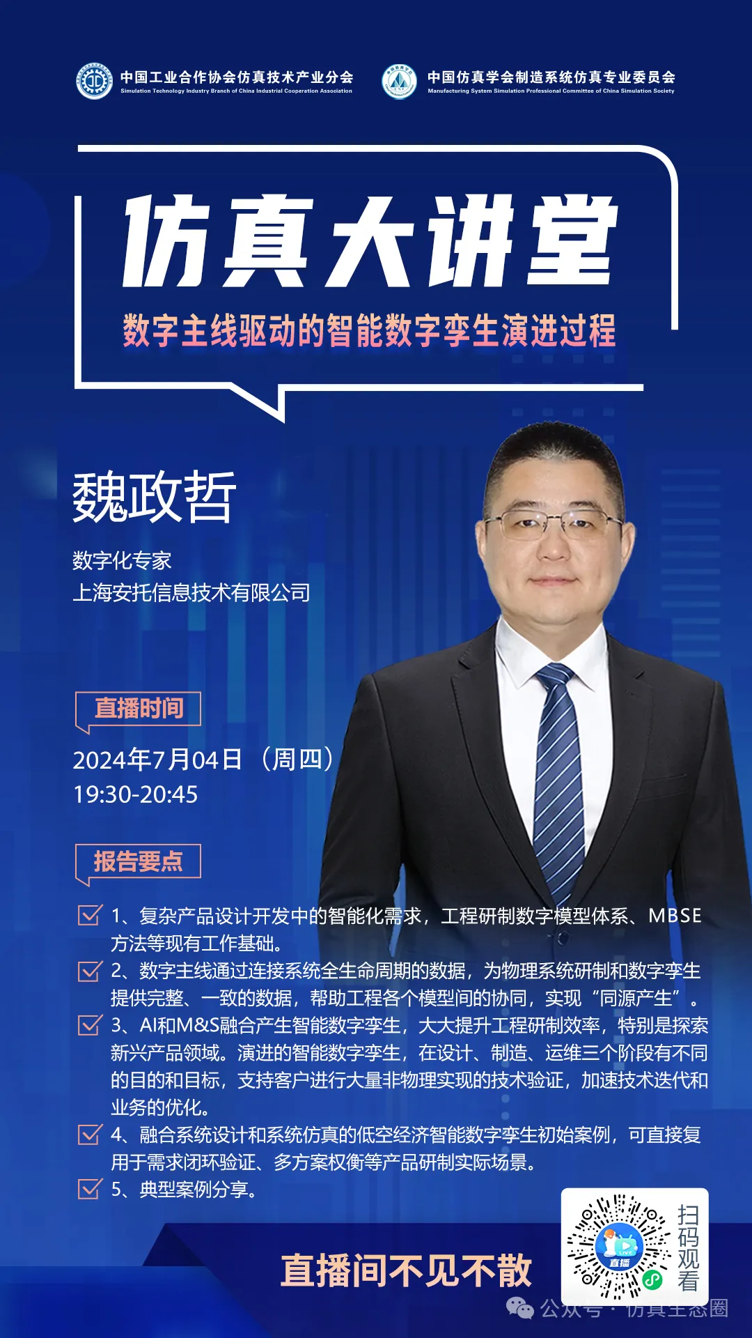 隨著實(shí)體經(jīng)濟(jì)與數(shù)字經(jīng)濟(jì)融合態(tài)勢(shì)日益深入,仿真技術(shù)、人工智能、數(shù)字孿生等科技當(dāng)前深入實(shí)施創(chuàng)新與變革,數(shù)字孿生技術(shù)在促進(jìn)工業(yè)企業(yè)產(chǎn)品研發(fā)、降本增效、轉(zhuǎn)型升級(jí)等方面,發(fā)揮著不可替代的作用。第11期“仿真大講堂”邀請(qǐng)上海安托信息技術(shù)有限公司數(shù)字化專家魏政哲做演講報(bào)告,主持人由北京大學(xué)智能學(xué)院馬修軍教授擔(dān)任。本期主辦單位:中國(guó)工業(yè)合作協(xié)會(huì)仿真技術(shù)產(chǎn)業(yè)分會(huì)、中國(guó)仿真學(xué)會(huì)制造系統(tǒng)仿真專業(yè)委員會(huì),承辦單位:上海安托信息技術(shù)有限公司、北京華汽工程技術(shù)研究院。
