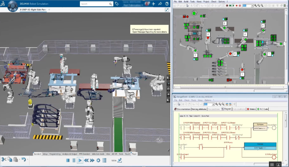 3D體驗(yàn)平臺支持工程師測試和調(diào)試所有程序(機(jī)器人,夾具,AGV…),驗(yàn)證I/O和HMI運(yùn)行狀態(tài),并通過在虛擬模型中創(chuàng)建臨界狀態(tài)來測試安全性。通過虛擬聯(lián)調(diào),可驗(yàn)證PLC程序、機(jī)器人程序、電氣/氣動邏輯、生產(chǎn)速率等自動化生產(chǎn)要素。