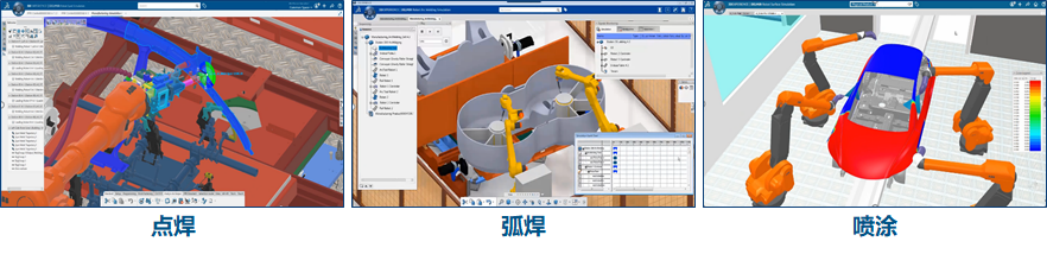 其他作業(yè)類型,3D體驗(yàn)平臺均支持完善的機(jī)器人仿真與離線編程功能。如點(diǎn)焊(或鉆、鉚接),系統(tǒng)支持鉆、鉚槍以及伺服槍的選擇和作業(yè),支持定點(diǎn)操作的夾具點(diǎn)定義,基于焊點(diǎn)快速生成機(jī)器人軌跡等。