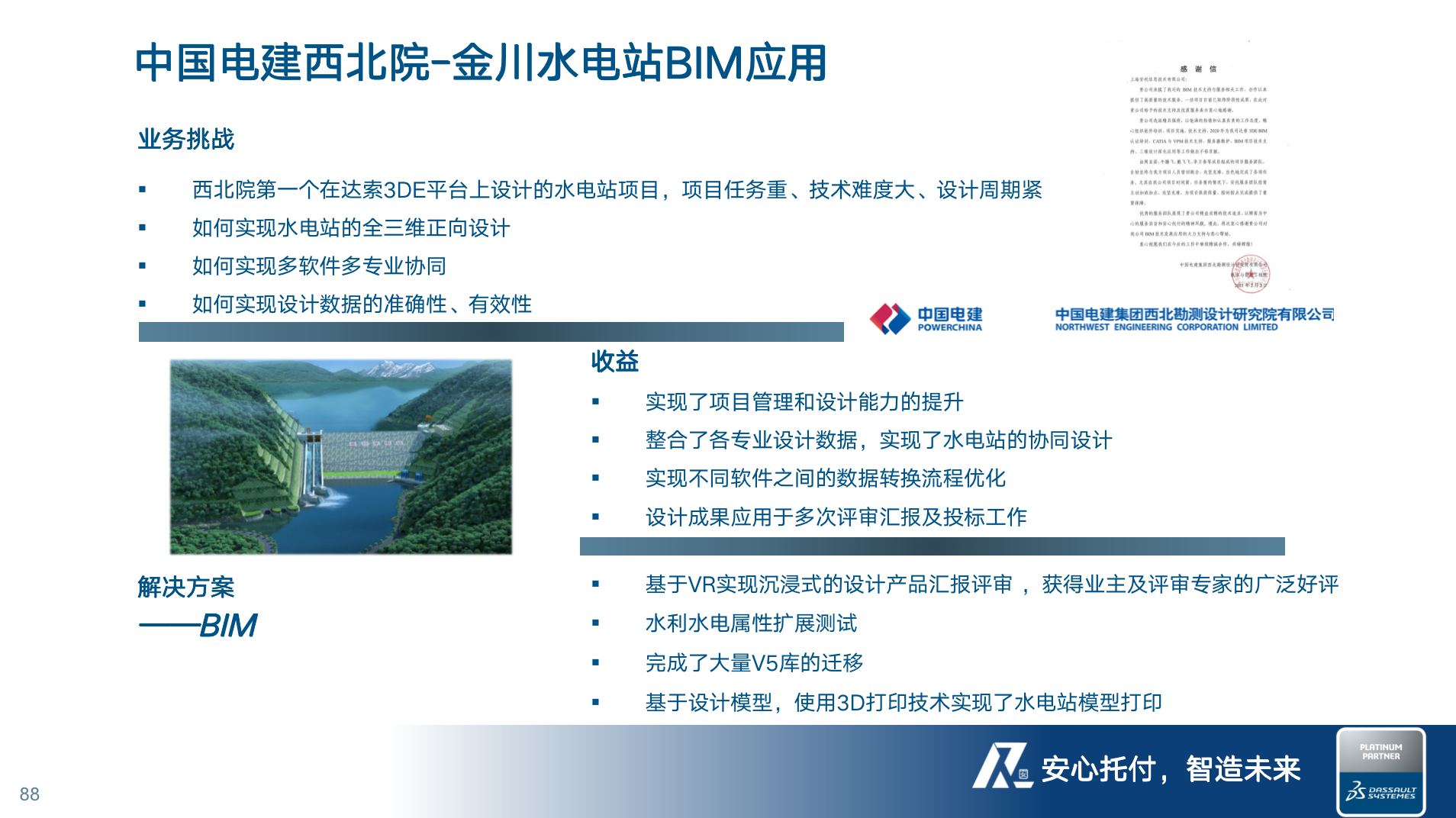 伴隨建筑信息模型BIM、數(shù)字孿生、產(chǎn)品全生命周期管理PLM等技術(shù)的交融碰撞,建筑工程行業(yè)的數(shù)字化轉(zhuǎn)型和可持續(xù)發(fā)展正在加速,應(yīng)用場景的探索異彩紛呈。通過本次產(chǎn)研合作,電建西北院和安托將組建高端人才隊伍,凝聚達(dá)索3DE平臺應(yīng)用智慧,運(yùn)用信息化、數(shù)字化領(lǐng)域多年服務(wù)經(jīng)驗(yàn)和專業(yè)積累,為用戶提供更優(yōu)質(zhì)的服務(wù)和解決方案,賦能水利水電等基礎(chǔ)設(shè)施領(lǐng)域數(shù)字化創(chuàng)新發(fā)展。