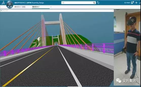 4、將設計完成的大橋在3DE平臺上進行渲染,基于VR眼鏡實現(xiàn)沉浸式的設計產(chǎn)品匯報評審,獲得業(yè)主及評審專家的廣泛好評。
