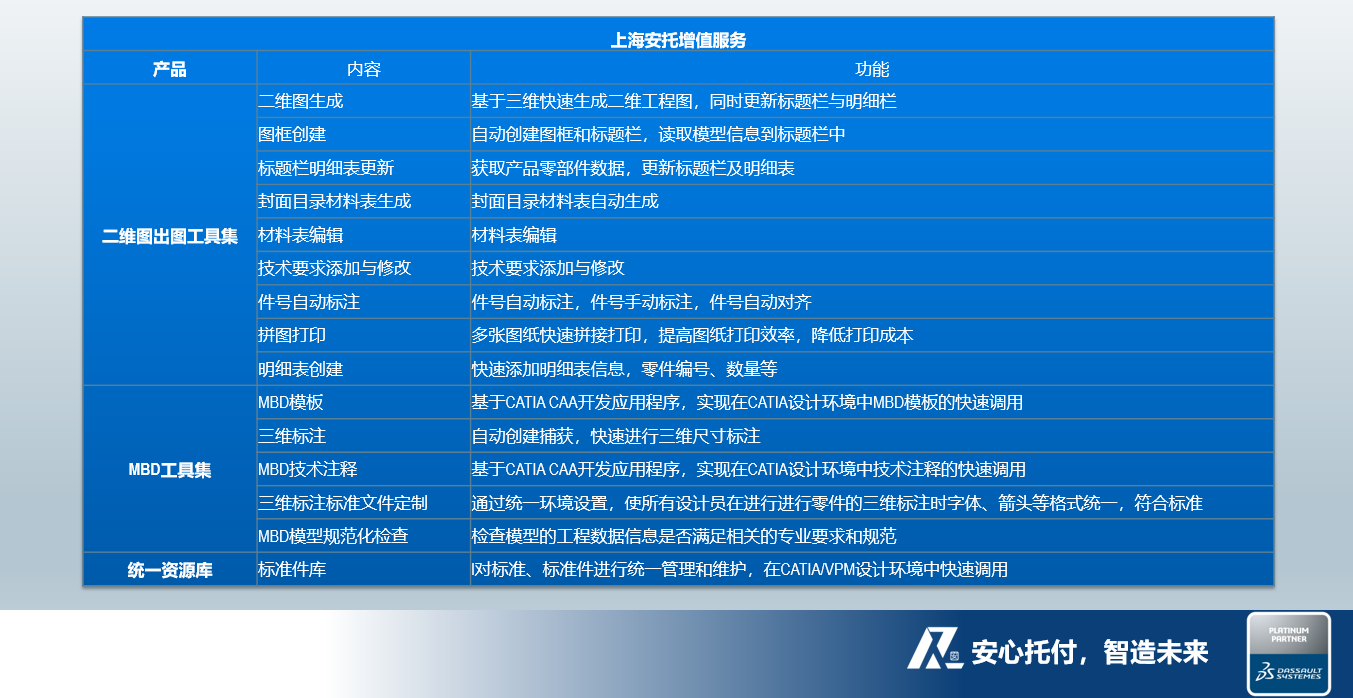 基于國(guó)內(nèi)生產(chǎn)制作業(yè)設(shè)計(jì)現(xiàn)狀和CATIA使用現(xiàn)狀,安托自主研發(fā)CATIA V5黃金包增值服務(wù)產(chǎn)品,滿足企業(yè)二維、三維設(shè)計(jì)高效化、規(guī)范化的設(shè)計(jì)需求與理念。安托CATIA V5黃金包增值服務(wù)產(chǎn)品主要包括:二維出圖工具集、MBD工具集、標(biāo)準(zhǔn)件庫。